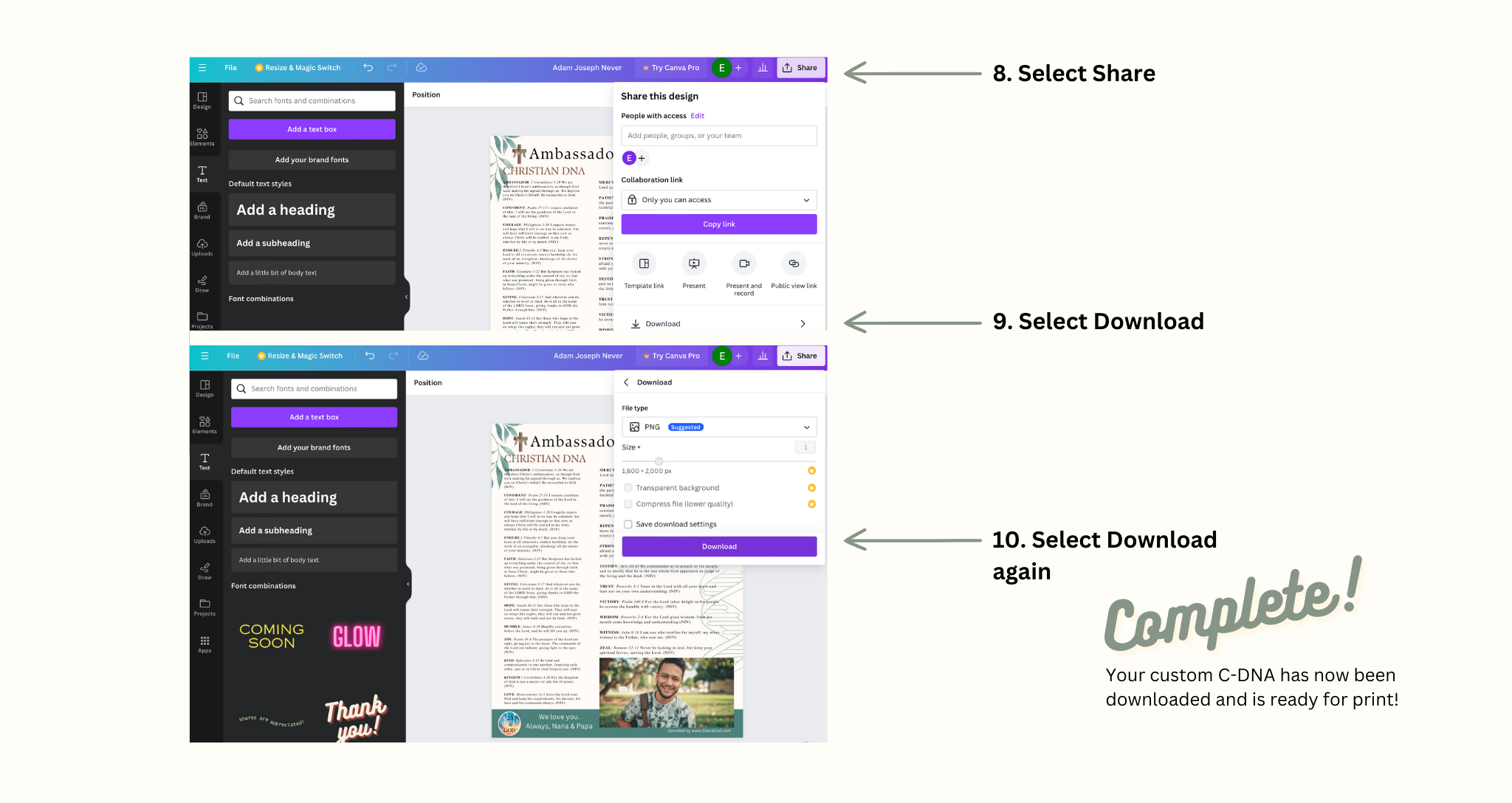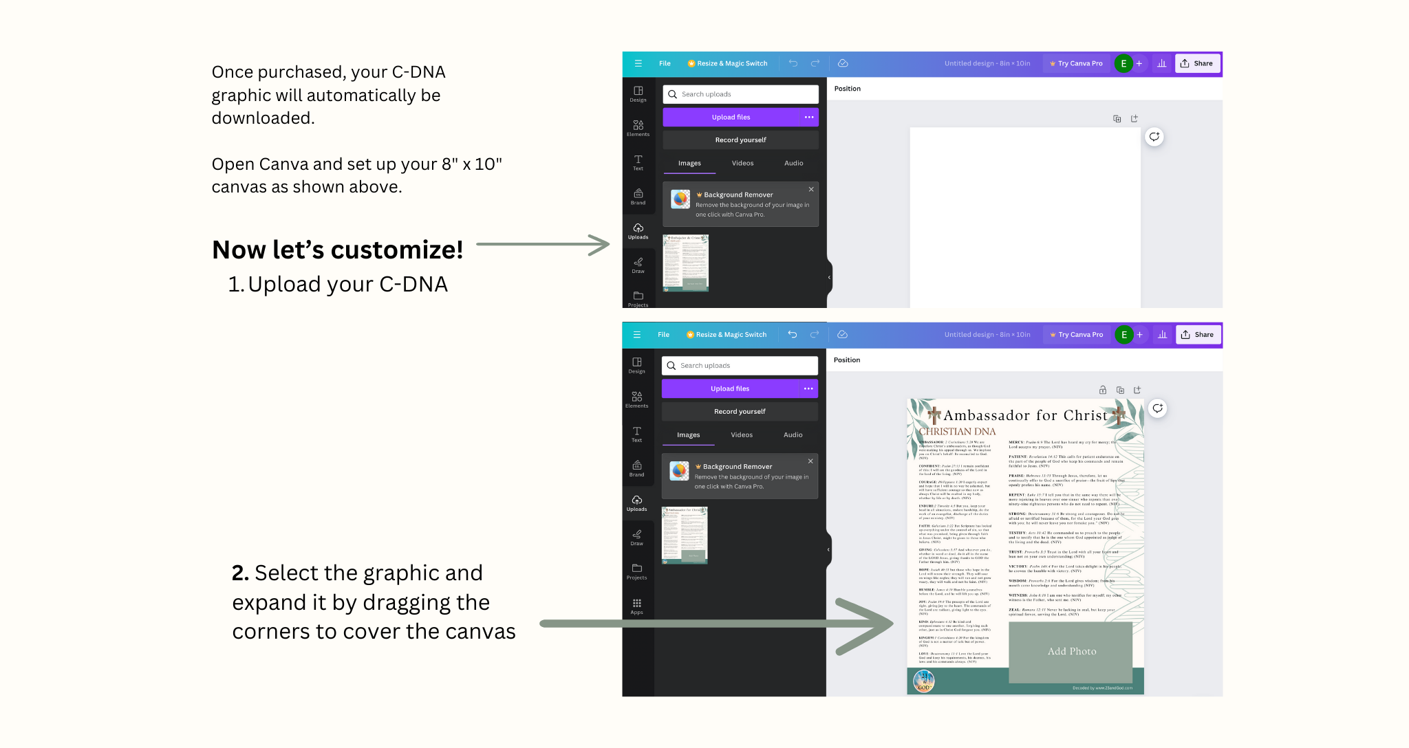 You may already know how to customize your piece in Canva, but if you would like assistance with customizing your C-DNA graphic, please check out the step by step slideshow below.