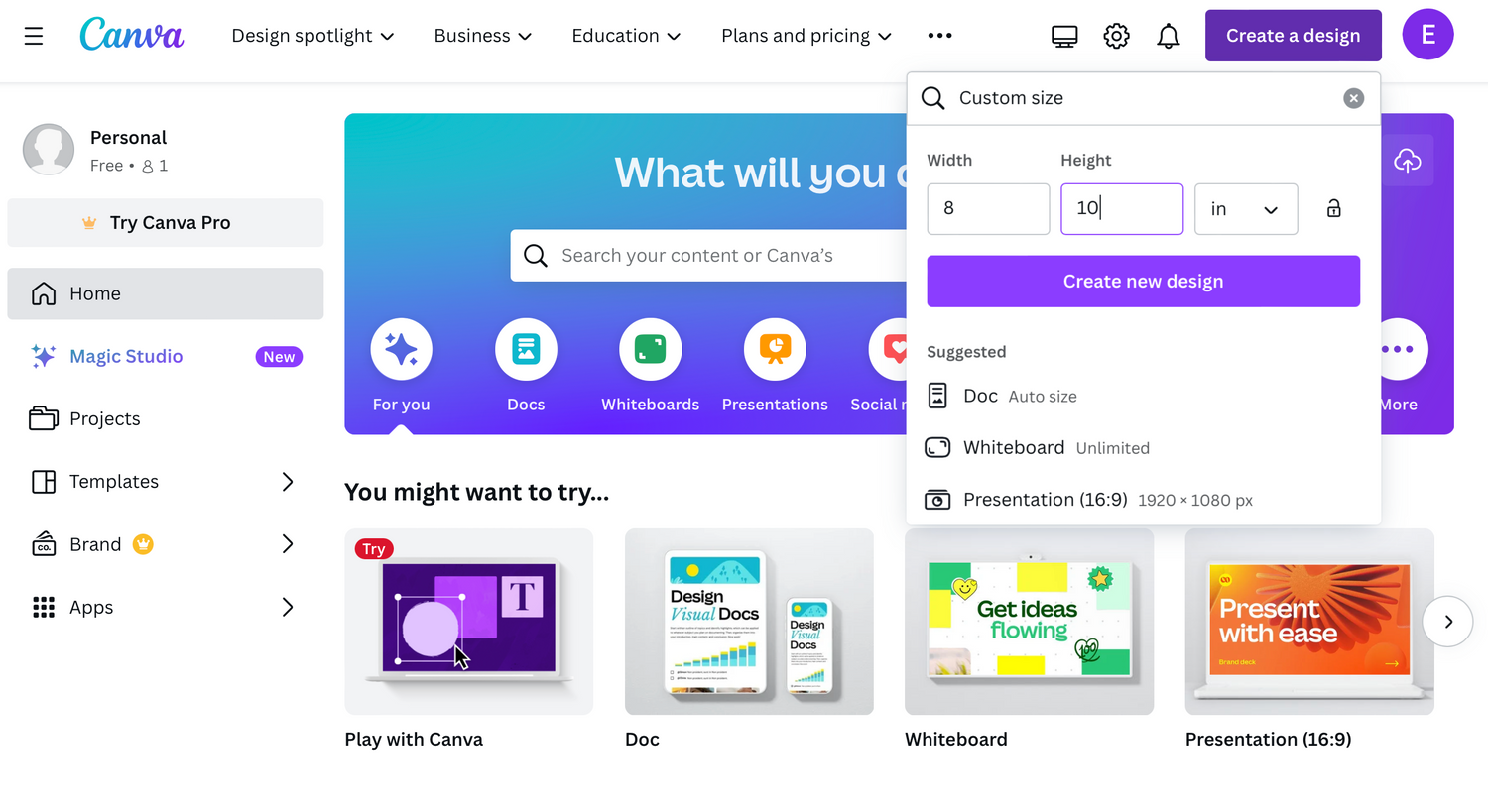 Select create a design and add in the dimensions. Once they are set, click the Create New Design button.
