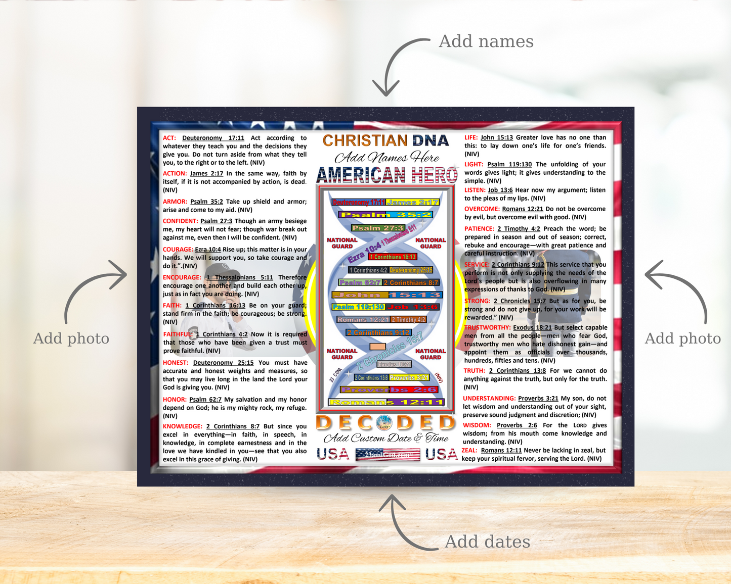 Introducing our captivating American Hero C-DNA graphic – a unique blend of faith and valor. This exclusive graphic unravels the inspiring journey of individuals who have served our country, eloquently narrating their experiences through 23 core scriptures.