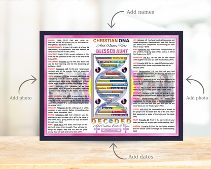 This extraordinary creation unveils 23 core scriptures, intricately woven into the virtues and experiences of a beloved aunt's journey with God. Key words, in inspiring red, delicately connect to scriptures, painting a visual masterpiece that celebrates the Christian DNA of a Blessed Aunt.